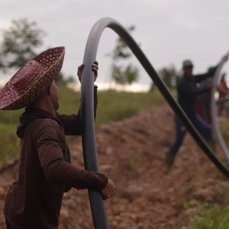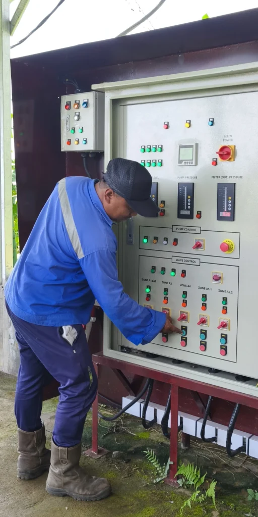 Konstruksi Sistem Irigasi – Proses konstruksi yang mencakup pemasangan jaringan pipa, distribusi air, panel kontrol, serta uji coba untuk memastikan distribusi air merata dan optimal.